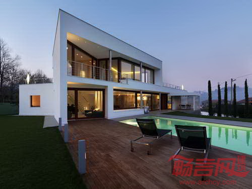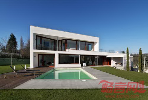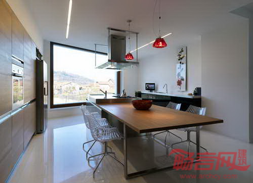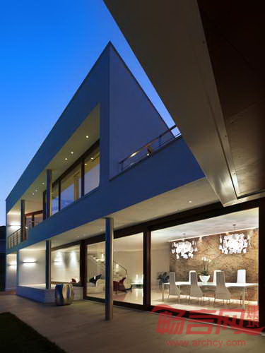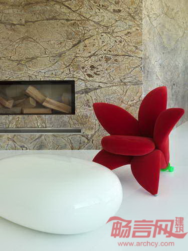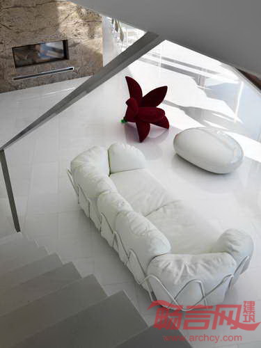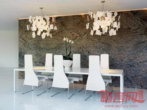 建筑呈一字形排开,厨房位于一端。建筑北面包含了较为私密的空间,南侧是泳池,潋滟了一尺碧波。起居楼层是洁白无瑕的空间,稍做点缀的化石墙壁的质感和部分家具上的彩色斑点。