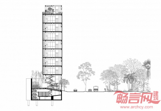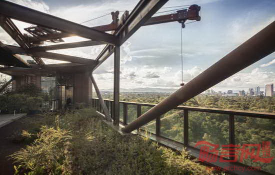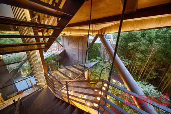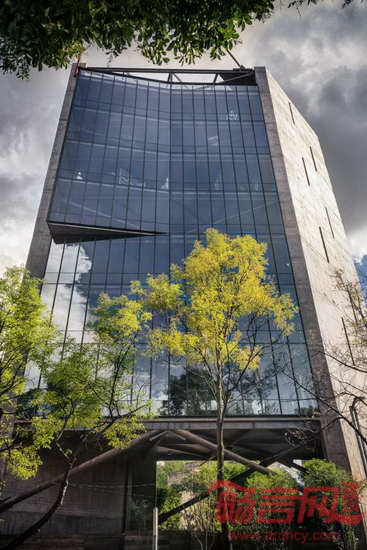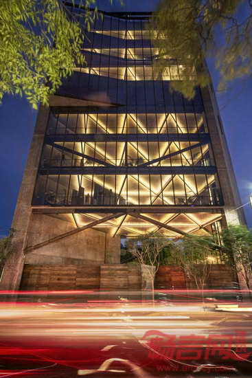 41大厦位于墨西哥城战略要地,面朝壮观的Chapultepec公园。建筑由TAX建筑事务所设计,共有7层,面积1820平米。在周边环境中,大楼在夜色中如同一座光影雕塑。室内空间根据建筑结构设计,两个结构混凝土墙面支撑了不锈钢夹层,外立面二级钢结构加强了该夹层。