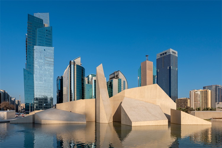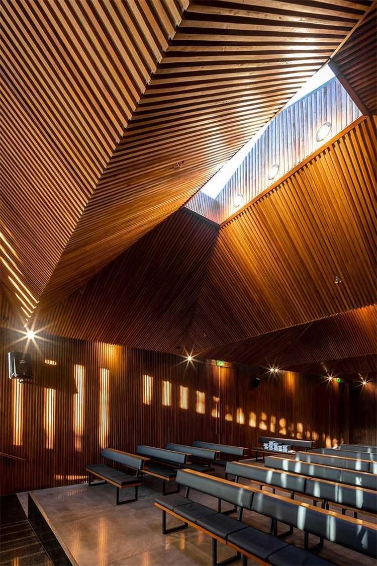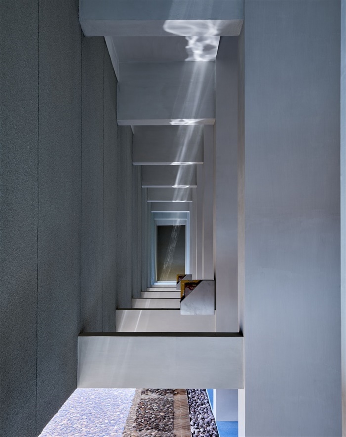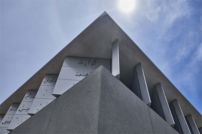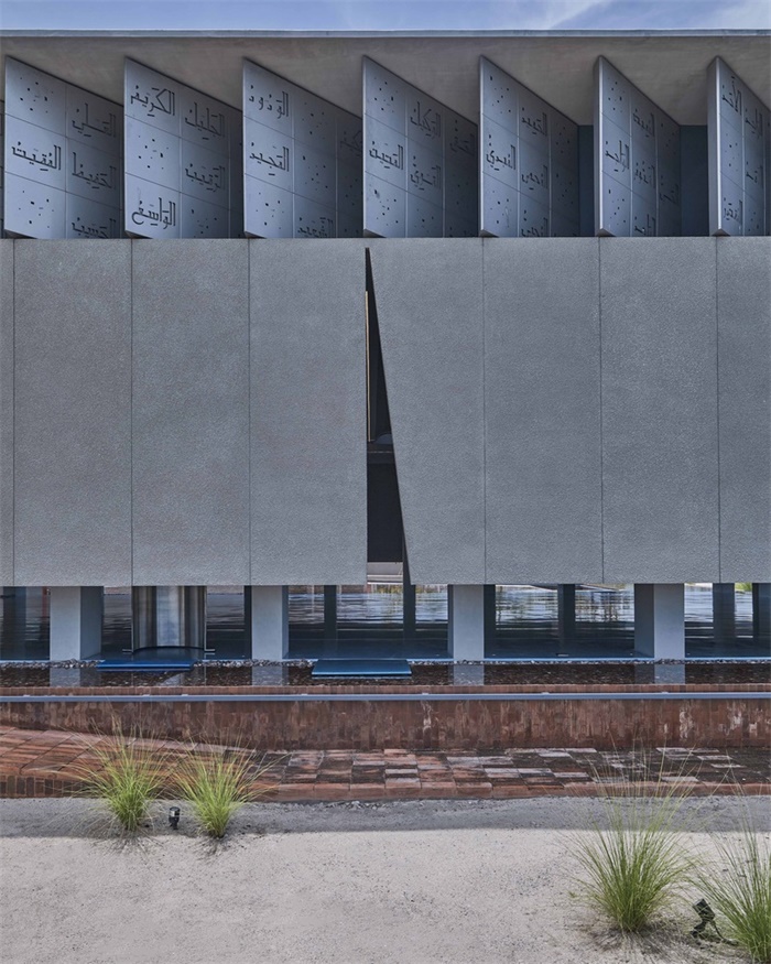 该建筑主要由混凝土和砖块建成,地板上有淡淡的蓝色水磨石。建筑师在建筑上部周围的不锈钢通风口上,用激光切割了99个名字,并保留了伊斯兰装饰的朴素和简约。