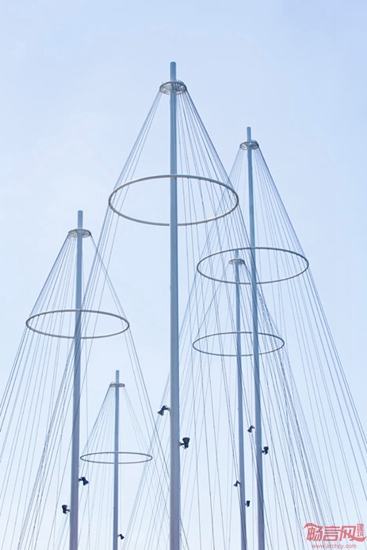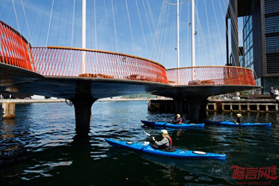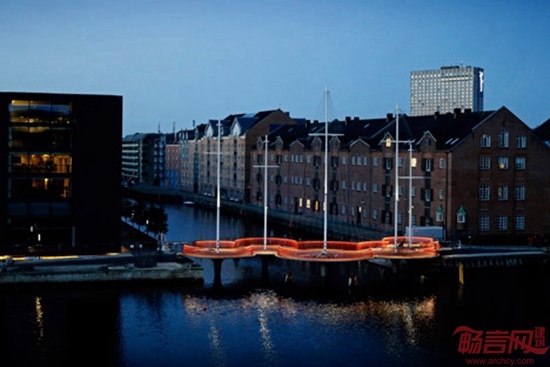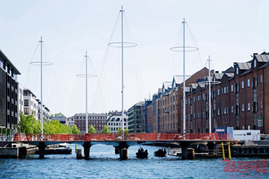 丹麦艺术家Olafur Eliasson设计了跨越哥本哈根运河的桥梁,标志是具有如同帆船桅杆般的设施。环形桥梁架设在Christianshavn运河上方,连接附近地区和另一端的Appleby广场。桥梁共有40米,是步行桥,由五个相互连接的环形平台组成。每个不规则环形设有高高的桅杆,这一设计参考了哥本哈根水道上常见的船只部件。桥梁底部和五个桅杆顶部之间连接了110枚线缆。