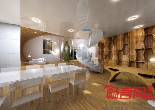 根据设计方案,“蚕茧”位于整栋房子的中间部位,设计师依照蚕茧的椭圆形状设计出了这个生态环保结构,它既是对两边房子室内空间的保护,也能使其向外部的延伸。“蚕茧”的圆形窗户是可以根据气温和湿度条件开关自如的,这俨然就是一个活的蚕茧。