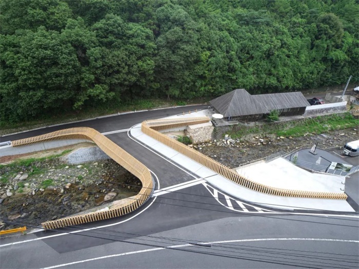 考虑到桥梁时常面临的灾害风险,钢筋混凝土框架与柏木材质的护栏结合在一起。木质单元的排列创造出柔和的曲线,呼应了周围山脉的轮廓。护栏采用的“105角”构件是日本木结构建筑中最常用的构件尺寸,这也为桥梁赋予了一种具有怀旧感的人性尺度。
