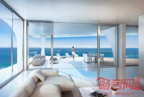 建筑的平行造型设计有利于使公寓面向南部阳光和能俯瞰海洋美景的落地窗。环绕大厦的阳台两端设有沙漏型柱子。住宅楼室内区域由巴黎PYR公司设计,迈阿密景观公司Raymond Jungles将在大厦周围创建一个热带花园。