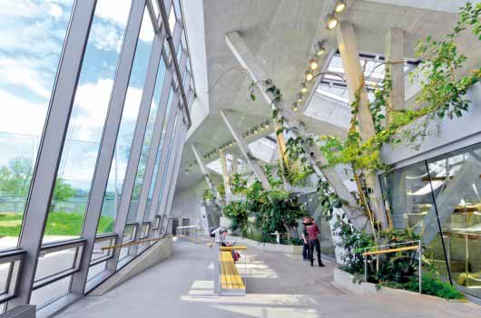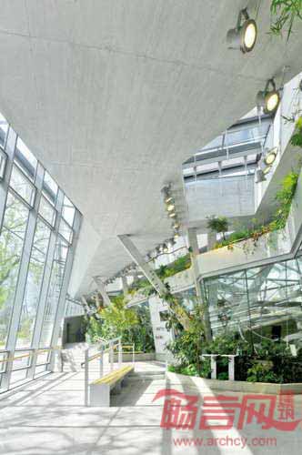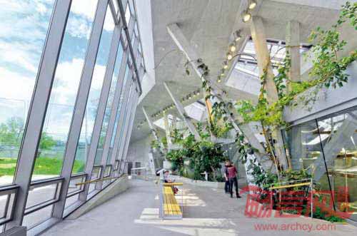 山顶表现成景观的一部分,而非建筑本身。建筑和绿化相得益彰,建筑成为公园的地形基础。