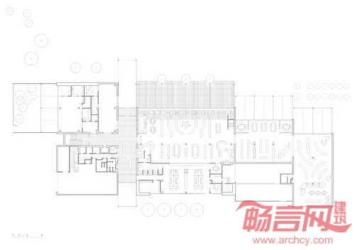 图书馆是若干相互联通、具有不同尺寸高度的矩形建筑的组合。从较高的入口去和两层阅览区出发,这些建筑结构顺地势向下来到小规模的儿童图书馆。