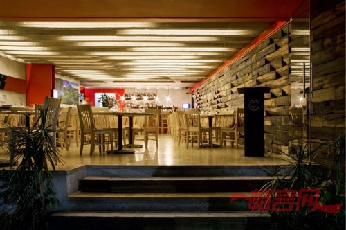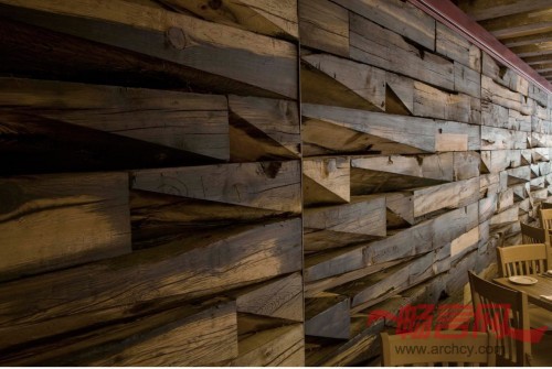 在此设计中,回收的木制火车轨道枕木被用来建造餐厅的室内墙体。这些有着不同角度的枕木赋予了墙体一种美妙的韵律感。