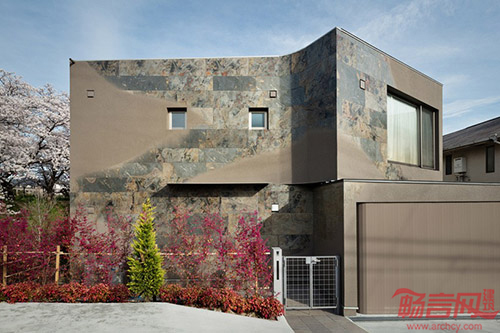 Triton住宅位于日本大坂市,旁边是一排樱花树。房子的特别之处在于它的外立面装饰,混合使用了彩色喷砂和1毫米厚度的石板,两种材料交融在一起,形成了一个平滑、有石材质感的外立面。