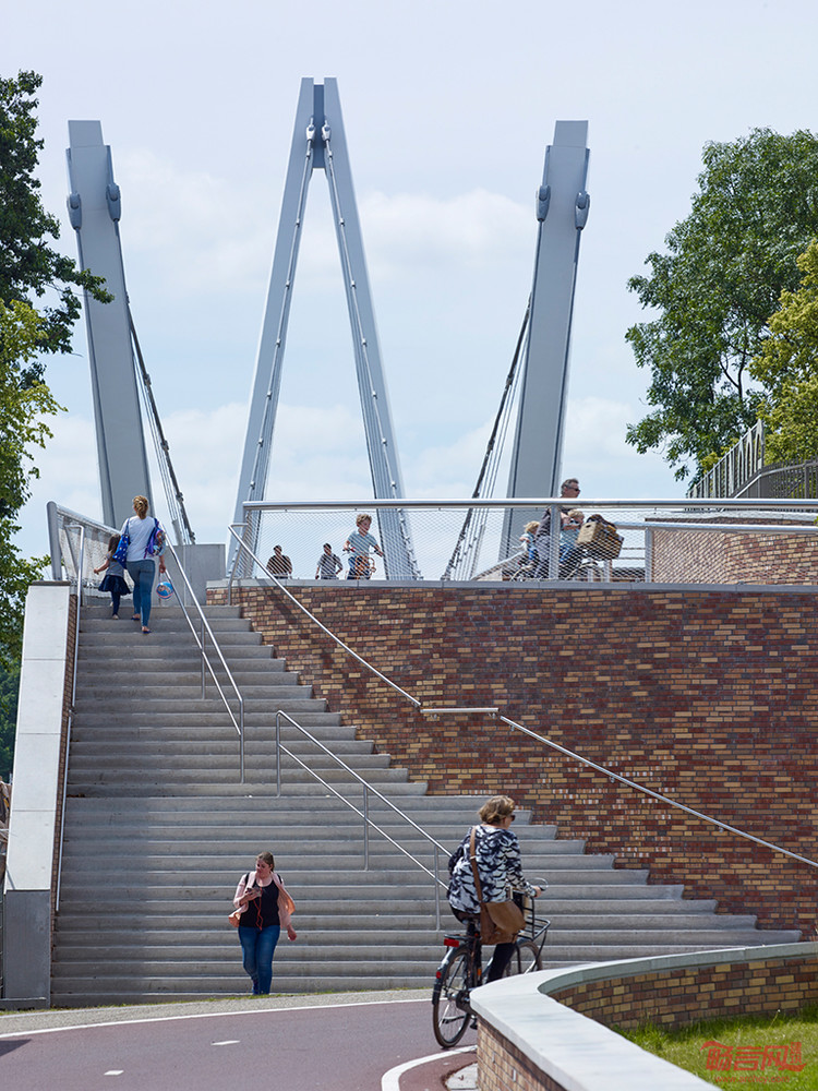 DafneSchippers大桥,俗称“欧米伽桥(Ω桥)” 位于乌得勒支,横跨阿姆斯特丹莱茵运河,于2017年4月3日开放通行。欧米伽桥是受乌得勒支市委托,由NEXT 建筑事务所与Rudy Uytenhaak建设局共同设计,并与Arup 和 B+B局协同打造的获奖作品。这个桥梁非常具有创造性:整个结构将一个循环和步行桥与学校和公园相结合,形成一个统一的具有凝聚力的空间。多重功能的土地使得最大程度地增加了绿化空间使得 Ω桥 变得独具吸引力,使它成为了一个具有活力的目的地。