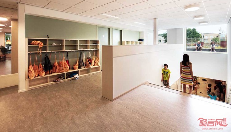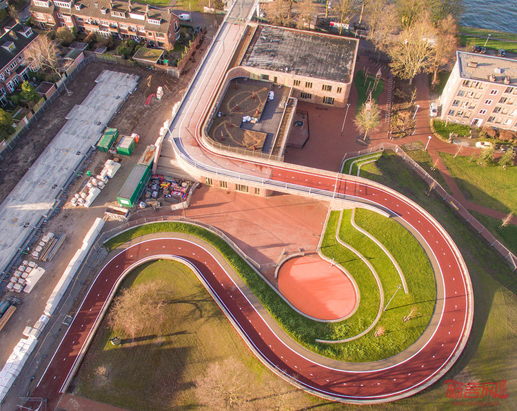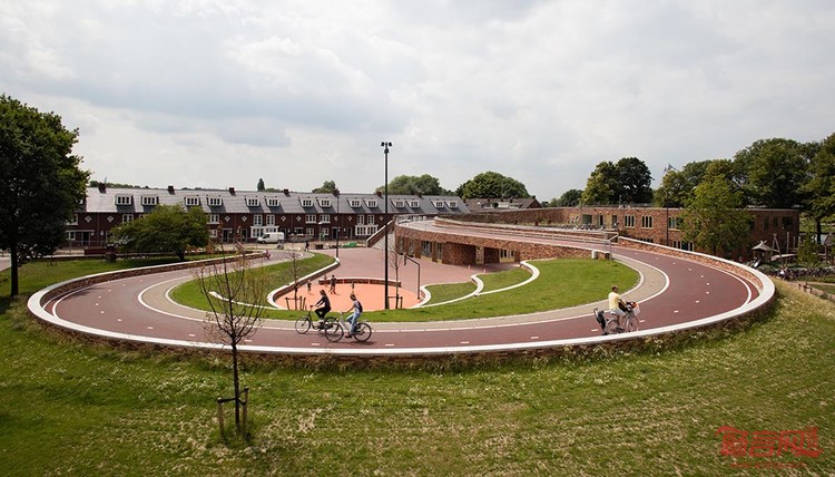 当骑行者从乌特勒支中心通过 Alogo Al 地区到 Leidsche Rijn 的新区时,一条长长的弯道引导骑行者上行穿过维克多雨果公园,然后通过学校屋顶上方的屋顶花园。NEXT建筑事务所的建筑师Marijn Schenk称:“在一个流动的循环的路线中,公园和学校被组合在一起,形成了一个连贯的基础设施,完美的结合了建筑和景观。”