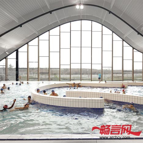 泳池之间的大支柱支持着波浪形的屋顶,朝北的一块块玻璃窗让游泳者能看到外面的塞纳河。