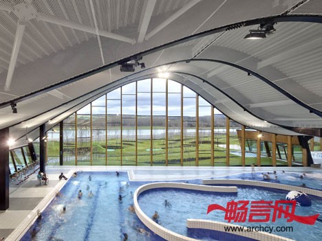 1. 大景观。从体育中心绝佳的建筑地点能看到Vexin山坡上的美丽风景。中心波浪形的绿色屋顶与塞纳河对面连绵的小山相互呼应。设计师将建筑本身就构想为一个景观,让它能加强使用者与周围自然环境的联系,无论人们身在建筑室内还是室外。