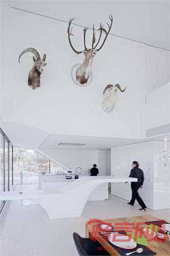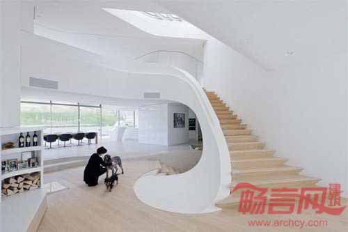 房屋的内部流通、视野布置和项目布局都贯彻了一种思路:转动。住宅的中心转动元素支撑了主楼梯区域,建筑线条由一套斜线运动限定,建筑布局遵从了太阳运行轨迹。承重混凝土结构被降到了最低程度。建筑屋顶和混凝土板只由四部分支撑:电梯井、两根房柱、一根室内柱。借助巨大的悬臂跨度,设计师创造了一个四角无需柱支撑的通透建筑。