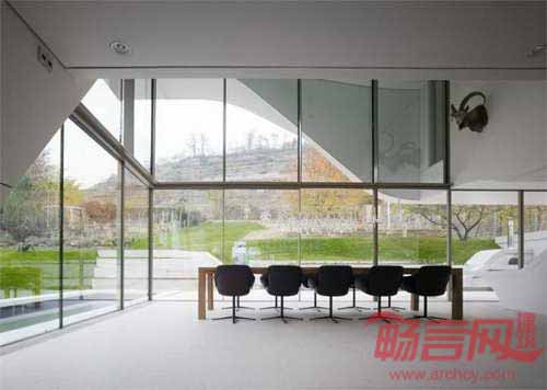 房屋餐厅区域位于一处双层层高的光亮角落,餐厅面向西北方向的广阔视野,宏伟的葡萄园风景形成了建筑的美丽背景。通过推拉窗的使用,餐厅一角极为敞亮,室内外的界限得以变得模糊。