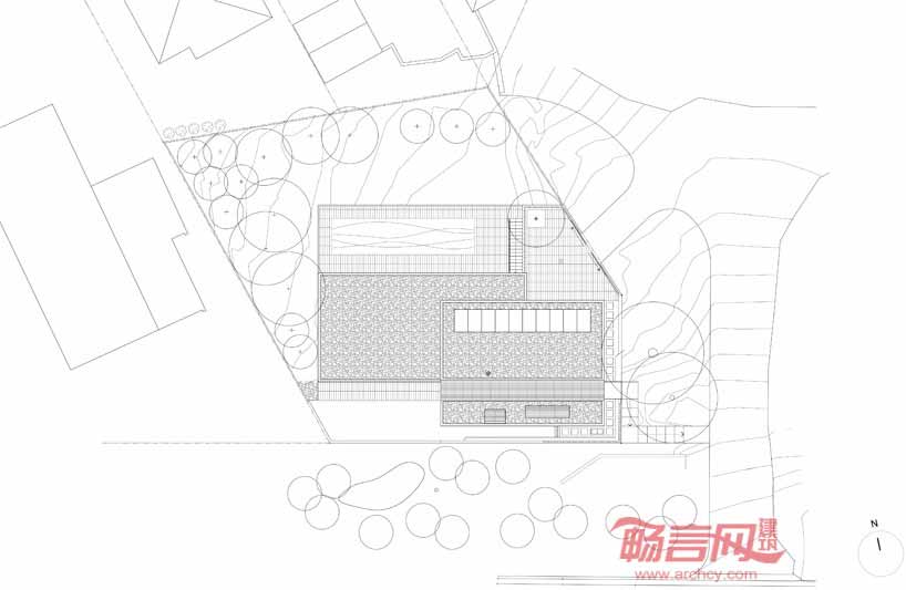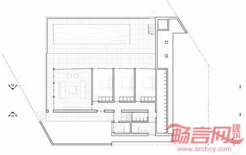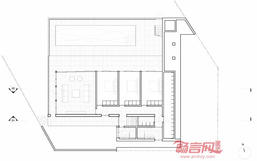 Boustred别墅由Ian moore建筑事务所设计,坐落在澳大利亚Mosman一处面北的悬崖上,较高的地势使人能在住宅俯瞰悉尼港。要想来到住宅的前门,必须先从街道上的人行天桥到二层。进入住宅内部后,住户会看到一个连通三个楼层的楼梯。长条形天窗结构将建筑分成两个部分,北侧包括生活区、卧室,而浴室、书房和服务区安排在南面围护型的区域内。