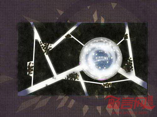 为符合甲方的要求,设计师创造出超大的水景球体造型,球体围绕一个中央垂直中轴设计而成。日落后,球型建筑会转变成一个熠熠发光的球体;白天时,建筑外表色彩不断变换,在阳光下闪耀着光芒,并使室内光照充足。