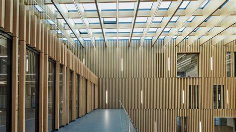 建筑立面选用了铝材,以此纪念公司的第一款产品——铝制滑雪杆。到达新总部大楼后,人们可以进入到一处通高中庭,其顶端直抵屋面。这个高耸的空间被垂直的木制百叶窗完全覆盖,让人联想起公司最初与滑雪运动的渊源。事实上,“Ski”这个词在挪威语中的字面意思,就是“一根又长又薄的木头”。