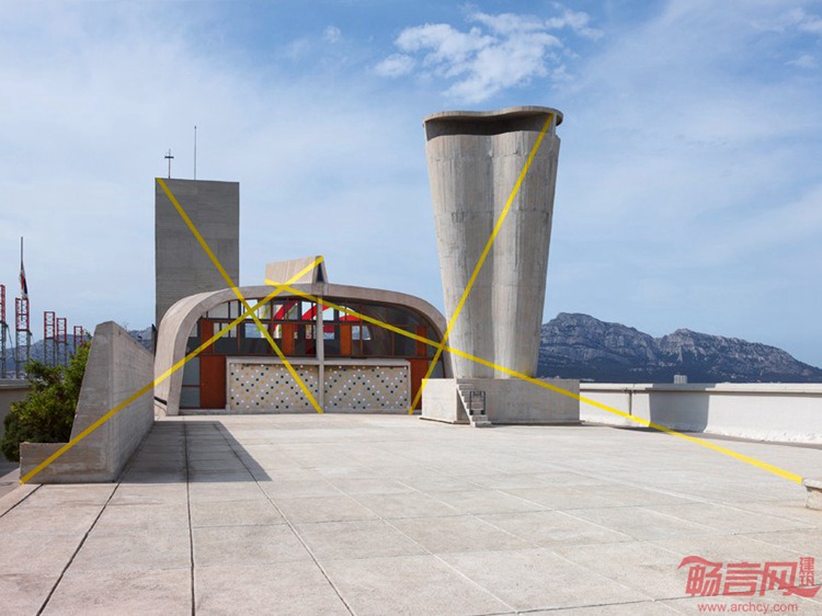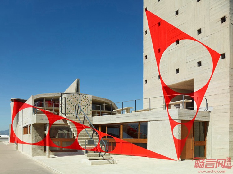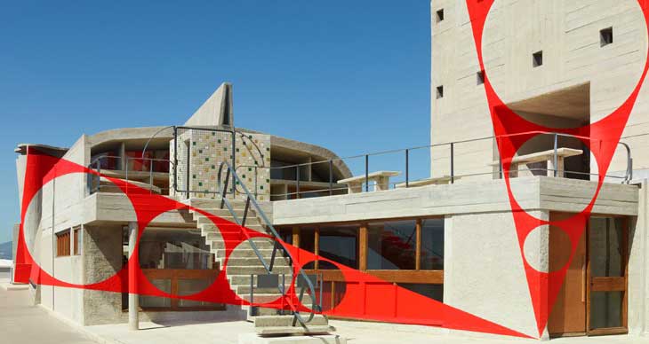 MAMO露天艺术中心位于马赛住宅上方。项目由柯布西耶1952年设计,2013年,屋面被Ora Ito改造成展览区,现在邀请Felice Varini让露台展现出不同的建筑风貌。跟随着Veilhan的脚步,Varini通过夸张大胆的绘画,为露台增加了新的视角。