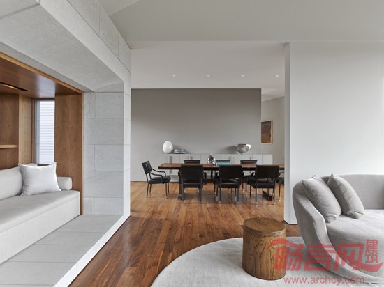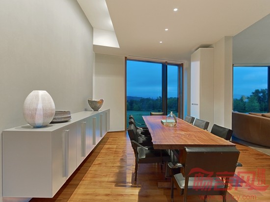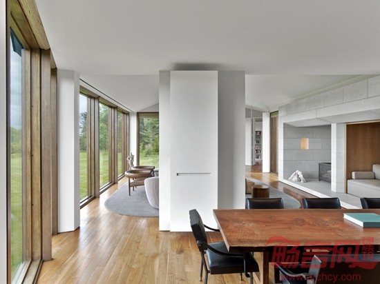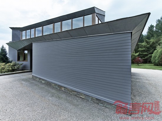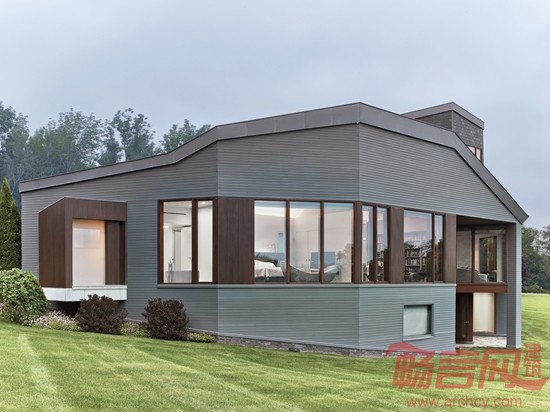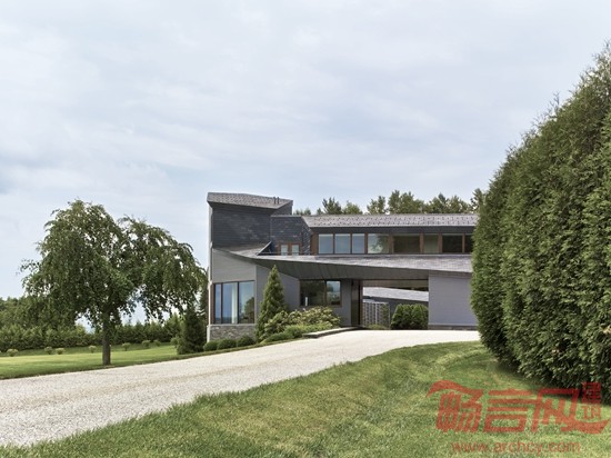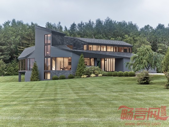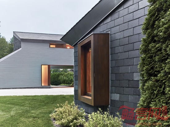 在美国马萨诸塞州阿尔福德市的一处平缓山坡上,有一栋依地势而建的弧形别墅,既保证了全景观视野,又围成了一个相对私密的庭院空间。
