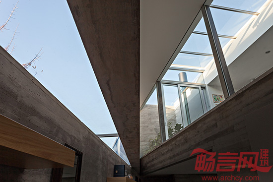 别墅的正面被解构成两个平面,形成一个“死胡同”几何结构,只有日照光线可以透过去,但是视线不能穿过。周围地貌是人工建造的,没有任何引人注目的东西,但是别墅内部有另一番景致:天井里种满了绿植,阳光照耀下别有洞天。