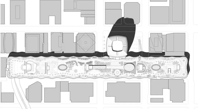 另外,方案通过屋顶公园的设计,为新社区打造了重要核心空间。设计最初阶段发现,旧金山的社区在历史上曾一度是公园和开放空间。客运中心的屋顶为打造大型公园提供了机遇,相邻的开发项目可以通过人行桥与公园相连,同时获得与公共交通枢纽的直接联系。连同周边地块的开发项目一起,包括环湾地区的弗里蒙特181塔楼、F地块塔楼、公园塔楼在内,在公园开发的刺激之下,这些项目已成为21世纪以公共交通为中心的发展模式的典型。在客运中心新区,十余个新地块被开辟出来,且均已售出,正待进一步开发。以公共交通枢纽为核心,包含6400个新居住单元、65万平方米商业用地、4公顷有余的开放空间,这里将被打造成为城市中心的多功能新区。