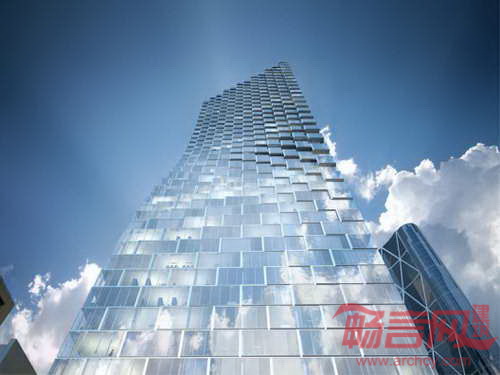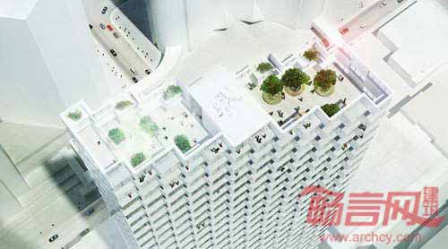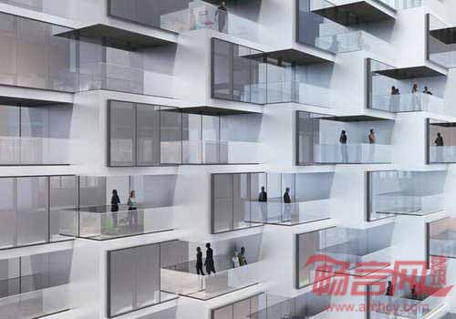 Telus Sky摩天楼项目旨在将加拿大卡尔加里公司大楼密集的市中心向适宜步行、充满活力的街区转变。项目总建筑面积达75万平方英尺,建造目的是使该区域从工作空间向宜居空间过渡。为了实现这一目标,大楼面区域的办公空间被紧凑的住宅进深取代。同时,立面材质也 不再使用光滑玻璃全围护结构,而是改成阳台和公寓的三维组合。BIG设计方案最终塑造了包含两种建筑类型于一体的外形,直线条结合了纤弱柔美曲线。