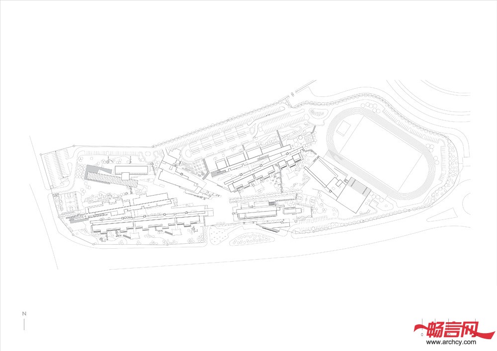 主题花园是这些校园建筑的点缀,而年龄则是主题选择的切入点。这些主题花园以儿童公园为起点,以深奥的望月和遗址花园为终点。在门前,四座巨型花园雕塑代表了学校的核心价值观。深红色的樱桃树零星的种植在校园里,为下面的石椅遮挡了阳光,并从视觉上标示了“花园村”的入口。行政楼位于学校的大门边,在它的入口处是一个彩色的艺术画廊,它缓和了典型的学校建筑所拥有的过于庄重之感。