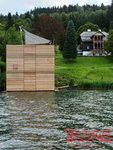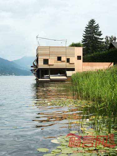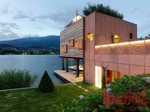 维也纳MHM建筑公司设计了位于奥地利SeebodenMillstaetter湖畔、位于水边陡坡底部一栋船屋。建筑沿水岸伸展,采用了两种材料,显示出房屋覆盖区域同地面和水面的关系。高于地面的建筑部分覆盖了铜板,而伸展如水下的部分则覆盖了厚木板。铜金属和西伯利亚落叶松条会随着时间风化,外观会相应发生改变。最终,黯淡的木材会同金属的绿锈构成反差。