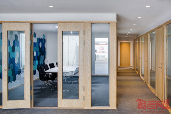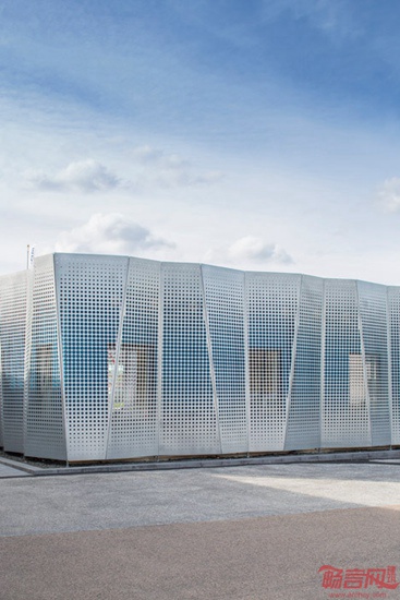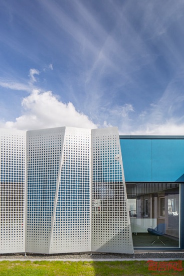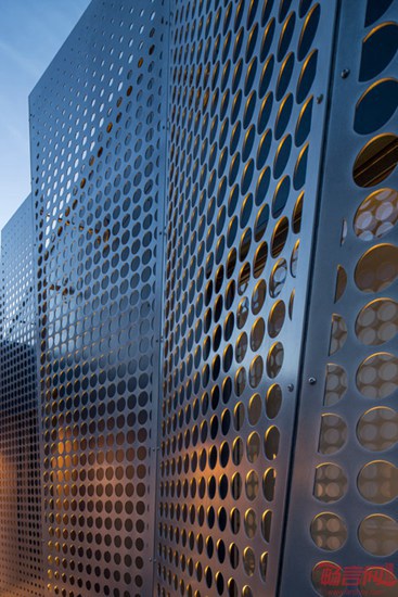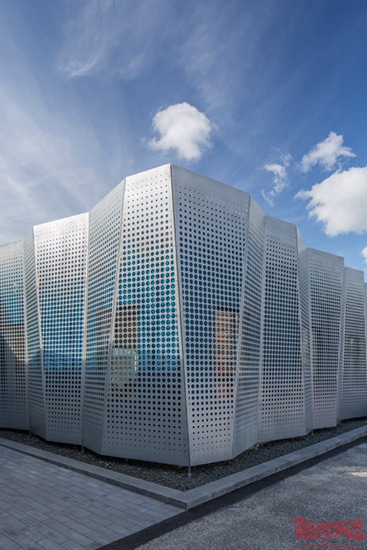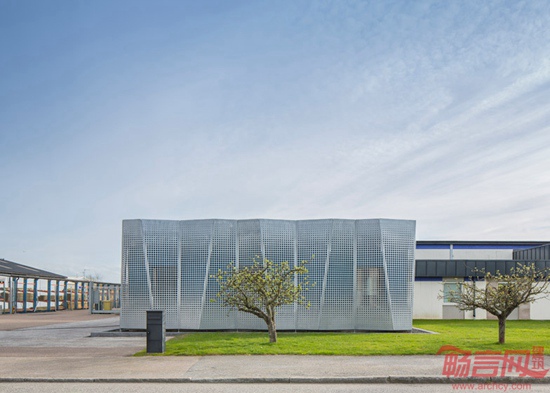 Johan Sundberg建筑事务所设计了瑞典Lund的一座办公楼。项目采用穿孔金属板营造外立面,设计师旨在“打破工业场地平庸的形象”。这一增建设施提供了五座办公楼和会议中心,业主是Lund市的Byggom建设公司。建筑仅有一层,同已有办公楼相连,外表覆盖了折角钛金属覆面板。这些穿孔板使阳光穿过,进入室内。穿孔板颜色多样,使原本平淡无奇建筑外形变得活泼起来。