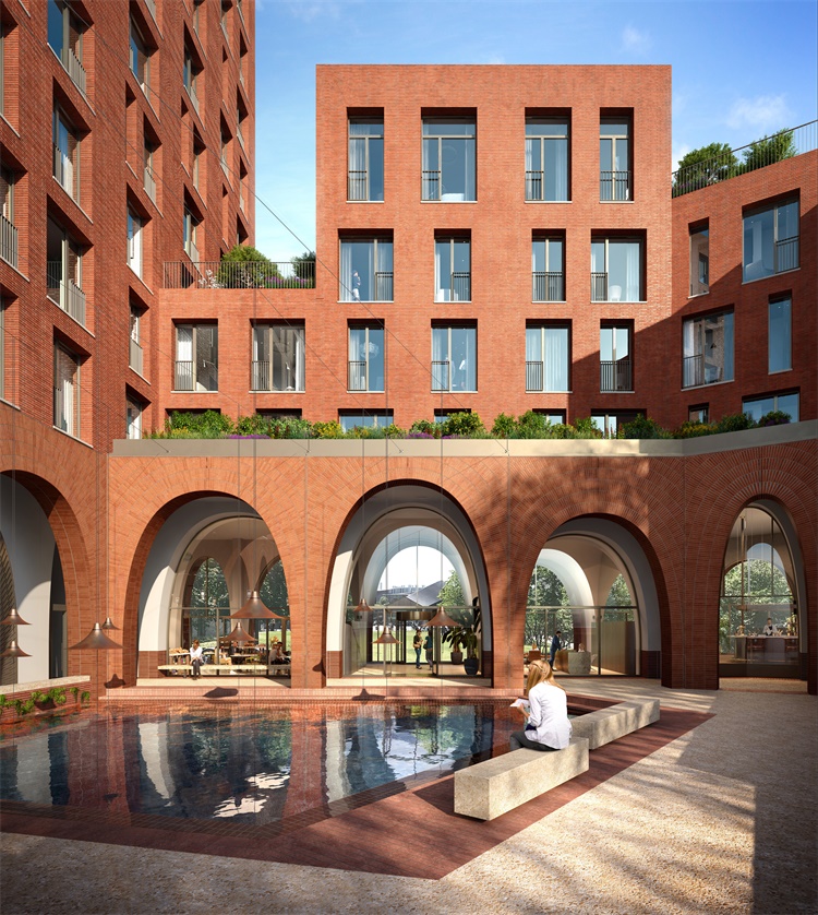 伦敦Cadence住宅项目的底层和顶层设有红砖拱门结构。由艾莉森·布鲁克斯事务所(Alison Brooks Architects)设计,位于国王十字车站的煤场旁。砖墙外墙后面将建造103座房屋。戏剧性的砖拱门形成柱廊,沿一楼而设,中央庭院设立了水景。入口处营造了白色拱形公共空间。拱门还出现在多层公寓顶部,公寓有一排嵌入式阳台。