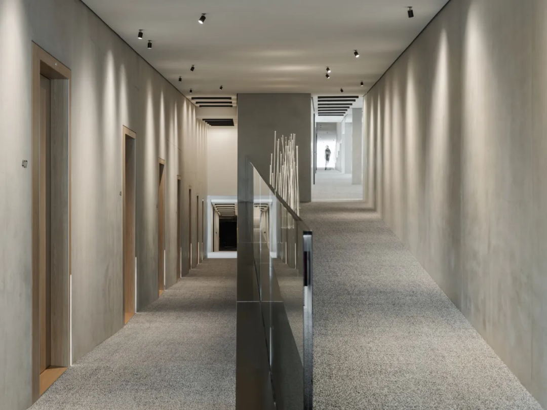 这个占地70,000平方英尺(6,400平方米)的酒店由五个之字形区域组成,从屋顶开始逐渐倾斜到地面形成一条连续的外部路径,这些坡道逐渐向草地下降并融入地面,这五块叠置的平板缓缓展开,融合周边山谷的环境,形成眺望景观的露台。