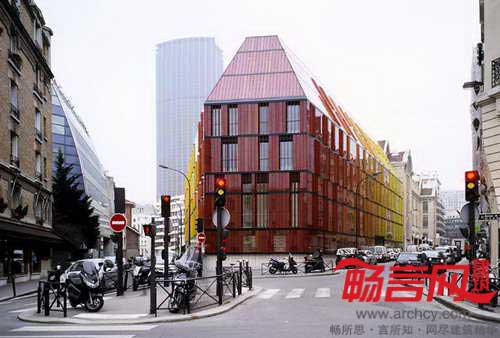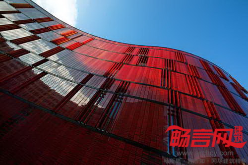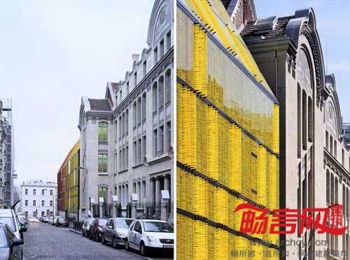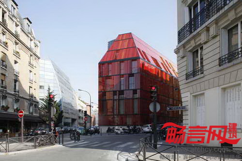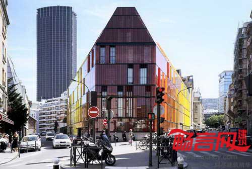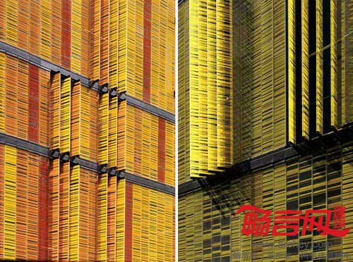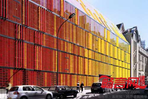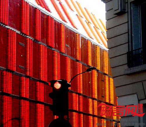巴黎Novancia商业学校建于1908年,AS建筑设计工作室完成了对它的改造和增建工作。改造方案忠实地契合了原有建筑的风格,完整保留了原有的砖块构造、飞檐、马赛克结构,同时使用增建部分赋予学校全新面貌。原先面向街道的是一面粗粝的砖石墙面,设计师用4102片玻璃百叶构成的新立面进行了替代,玻璃运用了不同色调的黄红两色,不仅呼应了原建筑的色彩,同时与Bourdelle博物馆协调一致。电控的玻璃立面从远处看有不透明效果,但近看能看出实际是透明的,通过不停地调整玻璃旋转角度,能够对楼内温度进行调控,降低玻璃产生的强光以及日照热辐射。