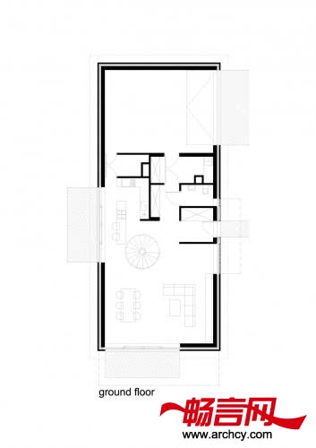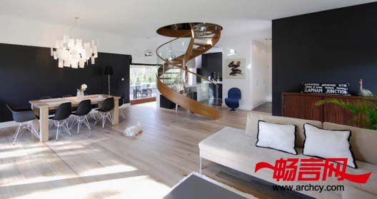 住宅是为一对有自己公司的夫妻建造的,所以在设计的时候,建筑师也充分考虑到了它们对住宅各功能区的要求。住宅的一层设有一个能停放两辆汽车的车库、一个可以在闲暇时间休息聊天的室外起居室、一个厨房、一个餐厅、一个大厅、一个门厅和一个位于住宅中心位置的漂亮螺旋楼梯。在二楼另设有一个大厅、两个供主人和客人使用的带浴室的卧室。