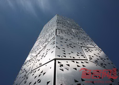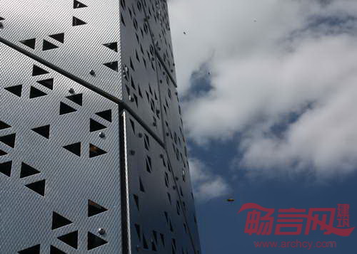 建筑表层铺盖了和蜂巢相似的六边形钢板。建筑表面具有一系列三角形穿孔,为内部提供了光线。