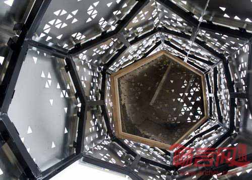 建筑顶部的一个六边形木盒子容纳了蜜蜂。盒子底部是透明玻璃,参观人员可以进入建筑内部,仰视蜂巢的模样。