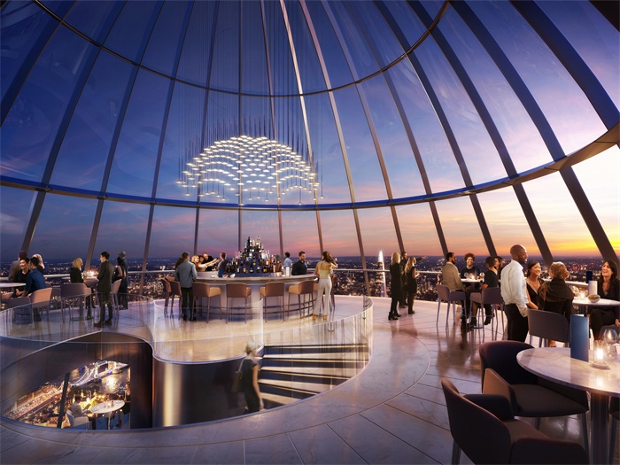 诺曼·福斯特事务所透露了伦敦市郁金香观景台视觉效果图。在伦敦金融城批准了该景点建设后,伦敦市长萨迪克•卡恩拒绝了这一提议,目前正在进行一项审查。其中包括郁金香空中酒吧,将建在建筑物顶端玻璃穹顶内。