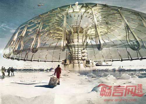 建筑杂志eVolo主办的年度竞赛旨在发掘创新性的未来摩天楼方案。今年竞赛的冠军授予了一个改造极地冰盖的巨型漂浮伞形概念设计方案。“极地伞”方案来自美国建筑师Derek Pirozzi,巨型伞状结构使海水凝固,为受全球变暖影响最大的北极地区补充了冰棚。