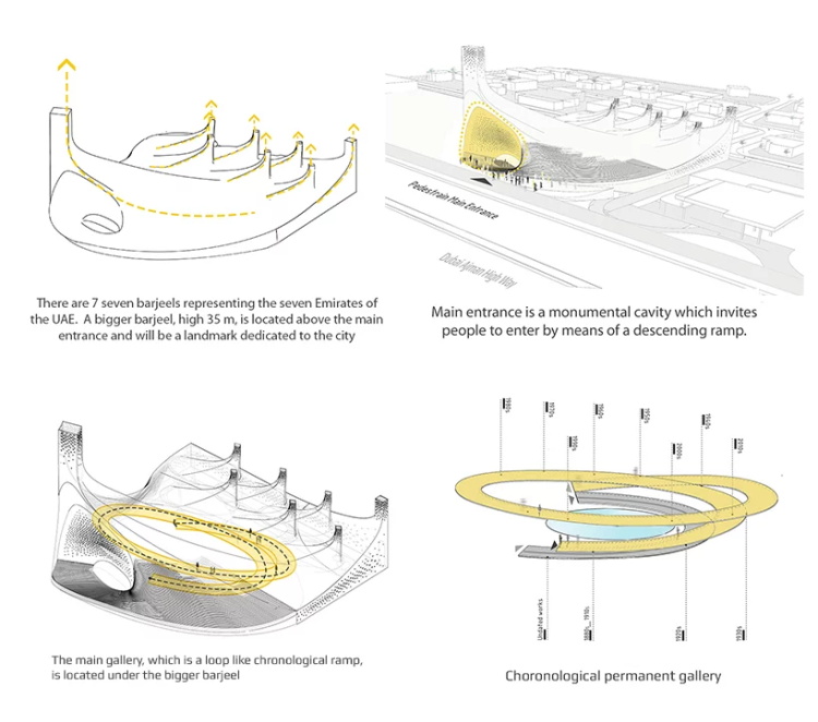 伊朗女性建筑师Habibeh Madjdabadi参与了一项国际建筑设计竞赛,完成了阿联酋巴尔吉耶现代艺术馆方案设计。项目获得2019年里法特·昌迪利亚建筑奖(以伊拉克最杰出建筑设计师之一名字命名的奖项)。项目构想成所在地区建筑文化地标,设计师将其塑造成Barjeel/巴尔吉耶(阿拉伯语,意为“风塔”,炎热沙漠气候的海湾地区用于通风的建筑结构)的当代建筑诠释。