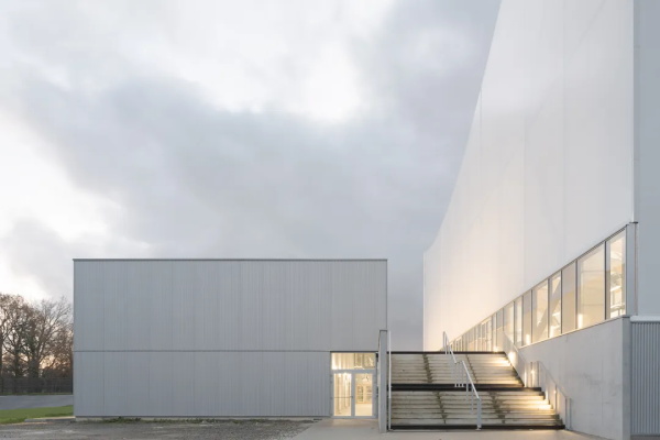 这条新轴线将穿过新建的体育馆,把建筑分为两个体量:北侧为多功能体育馆,南侧为壁球与舞蹈厅。步道以两个不同标高穿越建筑:上层外部通道通向看台顶部观景平台,下层连接公共大厅与社交空间。项目采用两种建造逻辑:紧凑体量容纳入口及供暖功能厅;体育馆则不设供暖,由纺织膜结构覆盖,膜面倒置支点的几何形态有助于夏季降温。夜晚,白色织物外膜如背光灯笼,使建筑成为城市中明亮的公共标志。