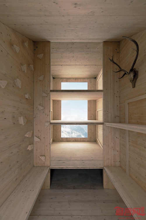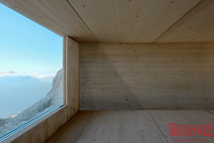 OFIS事务所设计了斯洛文尼亚Kanin山顶的冬季木屋。这一紧凑的住宅能容纳九位登山者,免受严酷极端的冬季气候,避免因暴雪和滑坡造成的危险。这一项目仅仅占据了山顶一小块场地。设计师和结构工程师合作,开发出这个具有悬臂结构、独立木质外壳的住所。