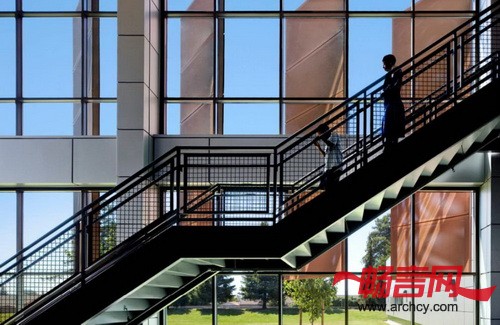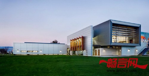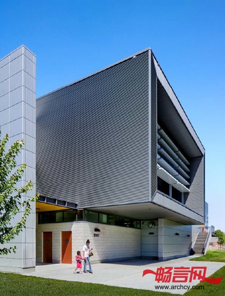体育中心的设计用高度透明的空间来展示里面的各个功能区域。三种颜色的低辐射玻璃巧妙生动的放在北东南三面的游泳池幕墙上,这不仅带来最终足的光线和最广阔的视野,也让这里成为一个波光粼粼的地点。夜晚时候,游泳馆宛若一座灯塔,成为让社区人民为之骄傲的建筑。大块玻璃不仅让健身房里的人们可以透过窗户看到公园、以提高社区的安全性,还可以吸引过客的注意力,也让人们可以到大厅里看到建筑里的各个活动区域。大厅是建筑的中心,在建筑的两侧都由进入大厅的入口,这样,人们在这里健身之后就可以很方便的到达Edes大街或者体育场。