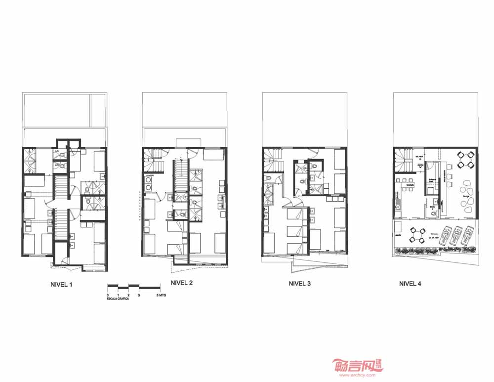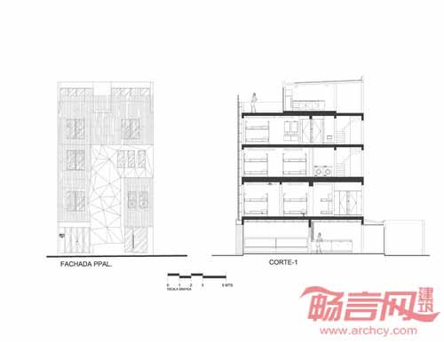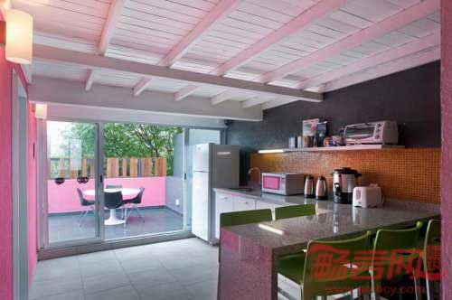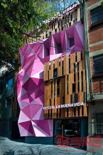 旅馆立面具有迷人几何造型,配合运用热情的品红色,视觉效果类似墨西哥式糖果包装纸;为了达到整体均衡,建筑另一侧使用了宁静温暖的重蚁木格架。