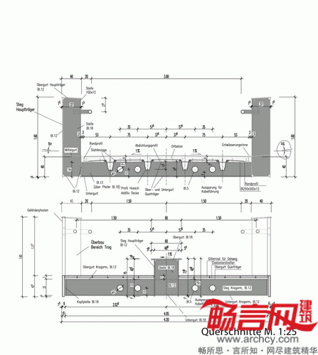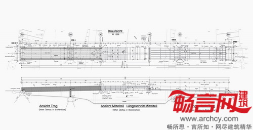 桥梁中部宽17米,中部和两端的横梁构成了一个封闭盒子形状。悬梁和前部顶板形成了截面为双T的图形。