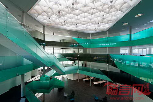 三角形元素在不同区域重复出现,涵盖了室内外区域。中庭赋予建筑三个分区,并保证了自然采光环境。建筑形状创造了明确朝向,提供了不同视野,并控制从半透明立面进入室内的光线量。