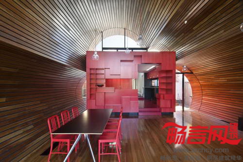 从临街的房屋正面上,客户展示出对其所在区域历史人物演化的尊重,低调的街道变化也掩饰了大量室内整修工作。原有结构空间基本使用白色,由异国花朵图案的过道地毯连接。通过该空间后,会看到一个分离出的红色“小盒”。它是房屋中央的厨房,起到贯通主要空间的桥梁作用。整个建筑最为出乎意料的部分是一个“云朵”状的挤出结构。“云朵”形象的后面,是弧线形环绕的有趣场所,供家人、朋友用餐和娱乐。