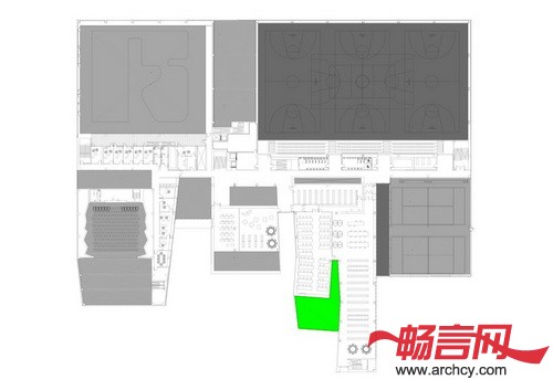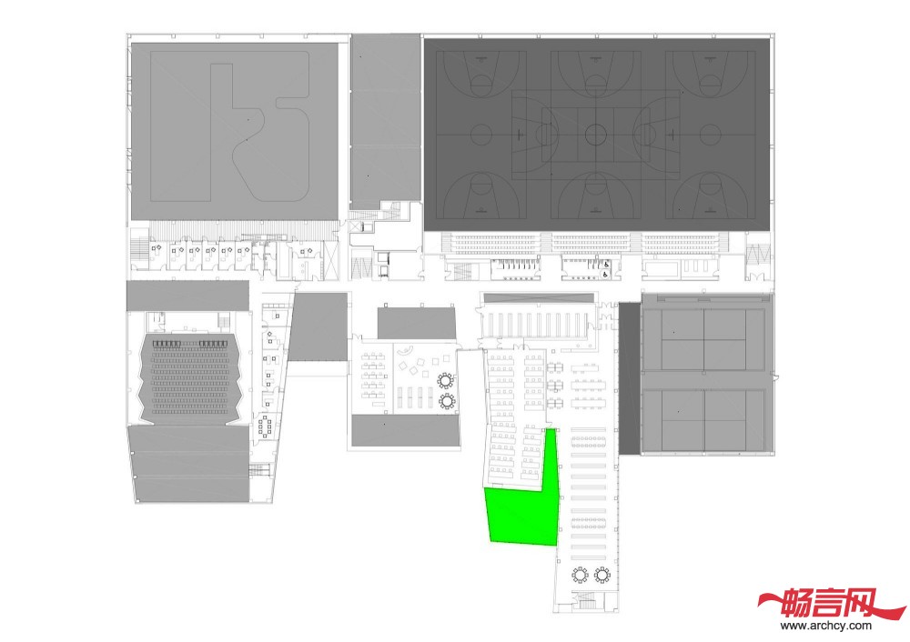 在保证室内宽敞、功能区域有序安排的前提下,建筑师将中心设计的比较开阔、开放,以吸引市民来这里,室外设计就能让人看出里面的功能:剧院、休闲和运动泳池、日光浴室、咖啡厅、内运动中心、图书馆、工作室、市民服务委员会等等。