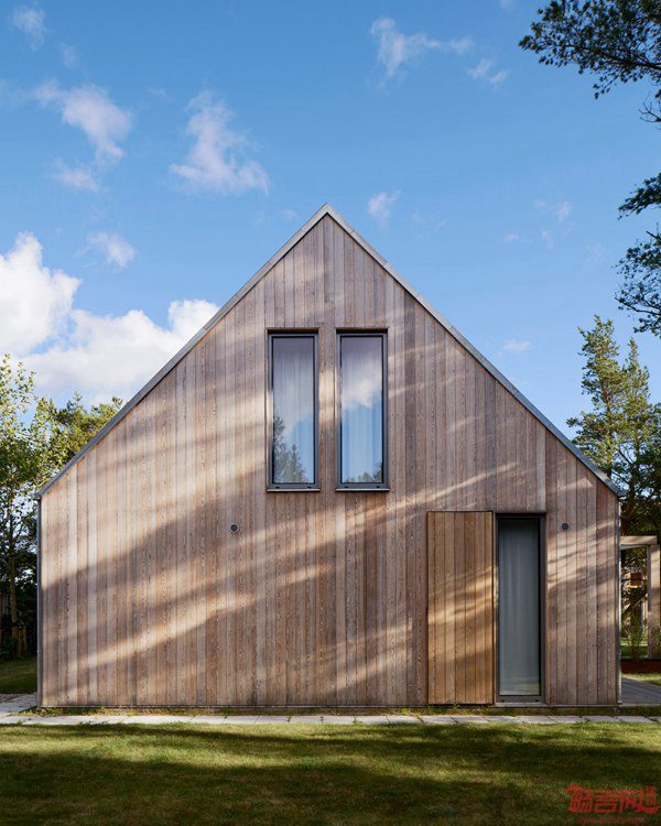 Johan Sundberg设计的这座山墙度假屋的室内外均覆盖了松木板。项目位于瑞典Oesterlen,比邻白沙滩和松木林。业主家里四口人,计划在夏季在此度假。户外墙板铺设了垂直的西伯利亚松木板,另外还涂了硅基涂料,以防止海风的腐蚀,坡屋面也做了同样处理。