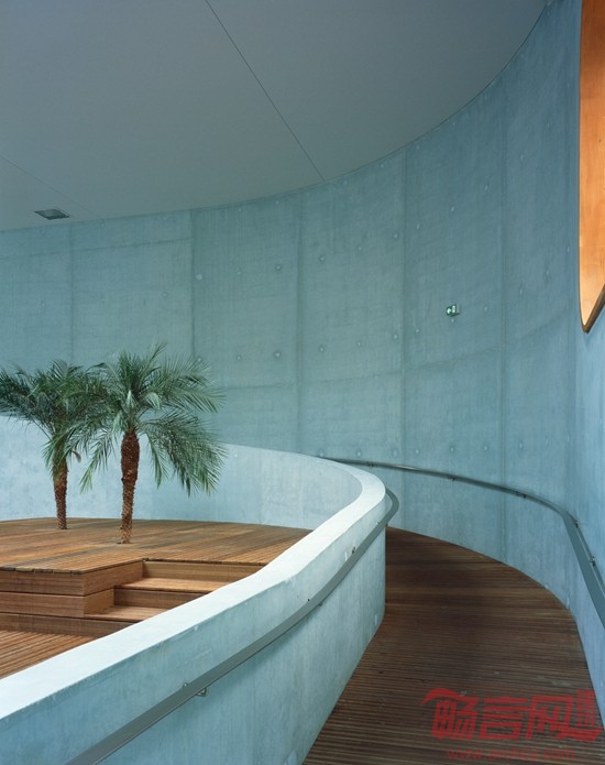 泳池大楼的设计本着流动性和开放性的精神,通过外墙和屋顶的玻璃板都可以有自然光线透进来。室内栽有绿植的阳光浴室采用的是可以移动的玻璃屋顶,可以在夏天实现自然通风。