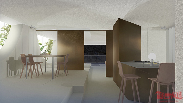 314建筑工作室设计了雅典Glyfada的法式住宅。这是一个改造项目,原建筑是一座1970年代的传统公寓楼。改造后,项目成为当代可持续性的出租住房,总面积300平米,占地370平米,共有四层。主要的可持续功能区位于中庭,带有光滑的天花板,使室内流动的温暖的空气变得流动起来,并释放到外界环境中。同时,建筑的西侧伸出的部分成为被动式太阳能墙,外层玻璃,内层隔热材料,中间层是隔热空气层,并添加了热带植物。