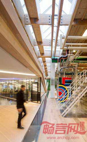 设计师将宽广的室内空间划分成若干区域,并安排了供鸟类栖息的植物和树木。自然光线从巨大的天窗倾泻而下,室内能听到潺潺水声。法国艺术家Jean Dewasne将涂料罐进行了装饰设计,成为工厂中的艺术品。工作楼层中,工作人员能够使用乒乓球桌和羽毛球场地。