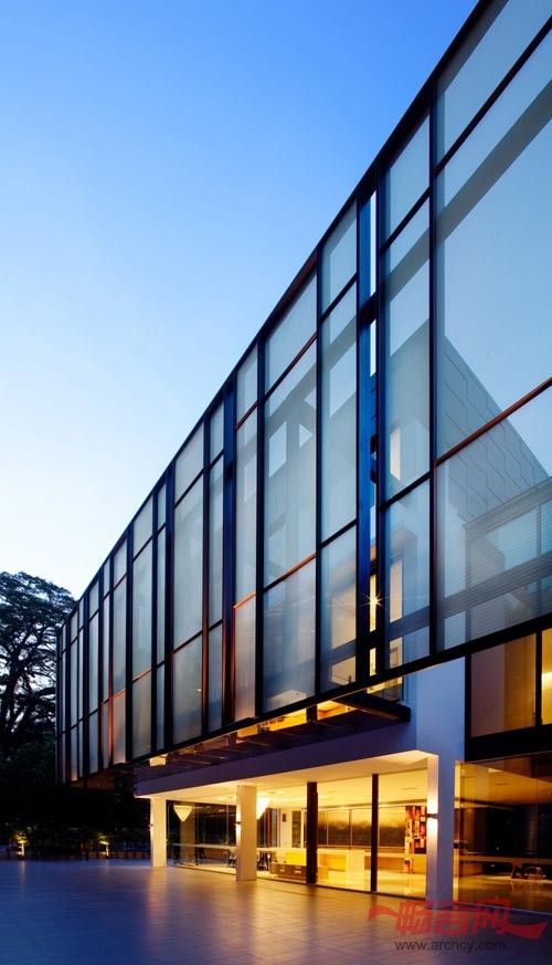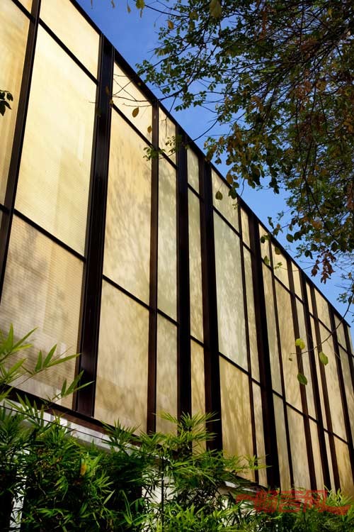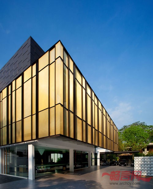 在玻璃墙后面种有一排用作屏风的竹子,可以是二楼金色网丝结构的前景,也可以是一楼玻璃建筑体的背景。中间的盒子状结构是该住宅的主要结构,带有一层不同空隙的金色网丝。这层金色网丝结构像一面薄薄的面纱遮掩着二楼的玻璃私人空间。到了夜晚,屋内亮起灯光时,这层金色网丝就会被溶解,从而显示出房间内部的情况。阁楼是一个不透明的铝板结构,创造了一种整体的安宁感和轻质感。